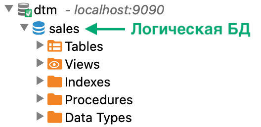 На рисунке ниже показана логическая БД в дереве объектов SQL-клиента (см. рисунок ниже).