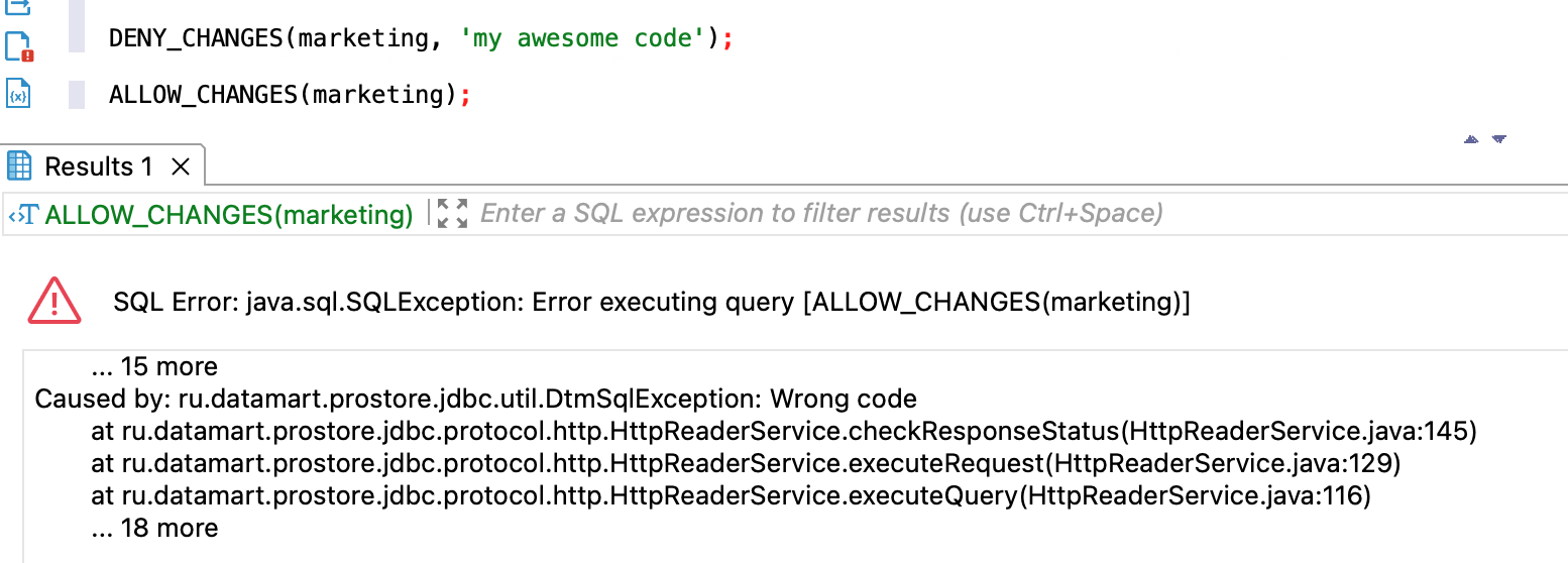 На рисунке ниже показан пример ответа ALLOW_CHANGES в случае некорректного кода-пароля. При установке запрета изменений был указан код my awesome code, который не был указан при снятии запрета.