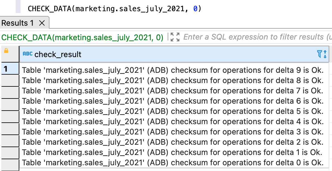 Чтобы проверить целостность данных в логическом и материализованном представлении, выполните CHECK_SUM отдельно по каждой дельте: если запрос вернул контрольную сумму, а не ошибку, это означает, что в данных дельты нет расхождений.