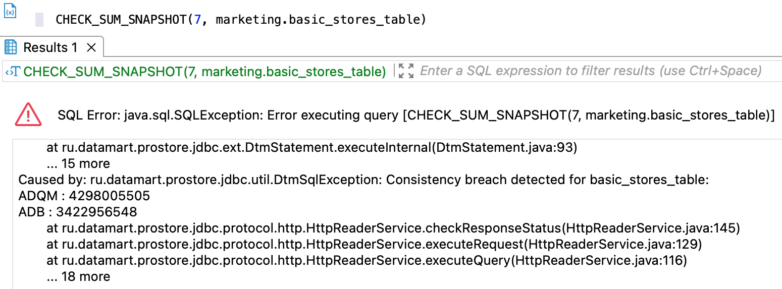 При наличии расхождений ответ содержит исключение с текстом ошибки Consistency breach detected for <entity_name> и списком контрольных сумм по проверенным датасорсам. Если расхождение найдено при расчете контрольной суммы по логической базе данных, система останавливает расчет на первом найденном расхождении, возвращает ошибку и не проверяет следующие сущности.