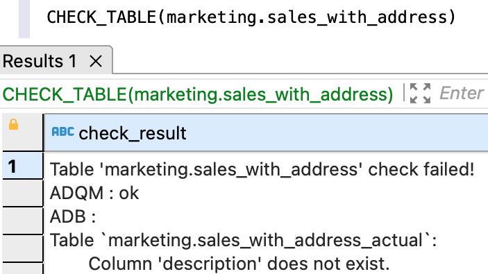 На рисунке ниже показан пример ответа при наличии расхождений, которые вызваны тем, что в физической таблице датасорса adb отсутствует столбец description.