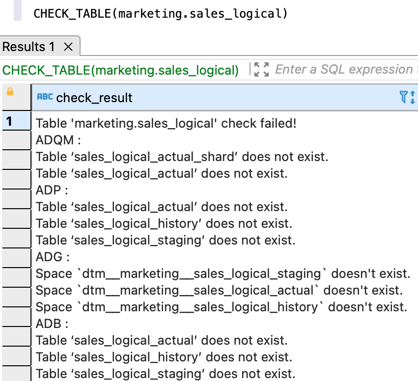 На рисунке ниже показан пример ответа при наличии расхождений, которые вызваны тем, что логическая таблица была создана только на логическом уровне. Подробнее о создании и пересоздании логической таблицы на логическом уровне см. в разделе CREATE TABLE.