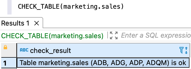 - объект ResultSet с одной записью, содержащей результаты проверки, при успешном выполнении запроса;