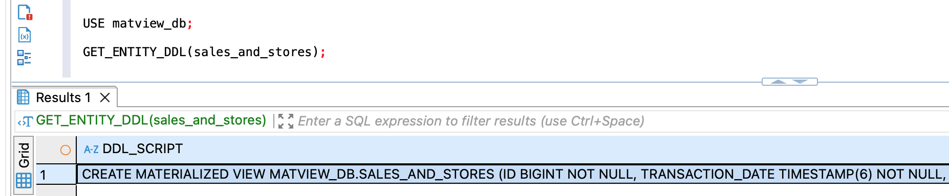 На рисунке ниже показан фрагмент ответа GET_ENTITY_DDL по материализованному представлению sales_and_stores.