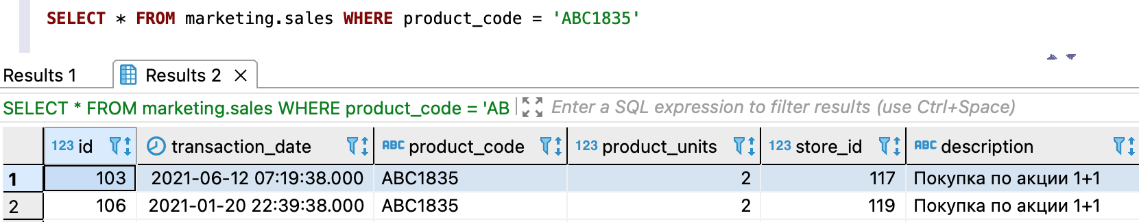 На рисунке ниже показан пример запроса из логической таблицы sales с помощью SQL-клиента.